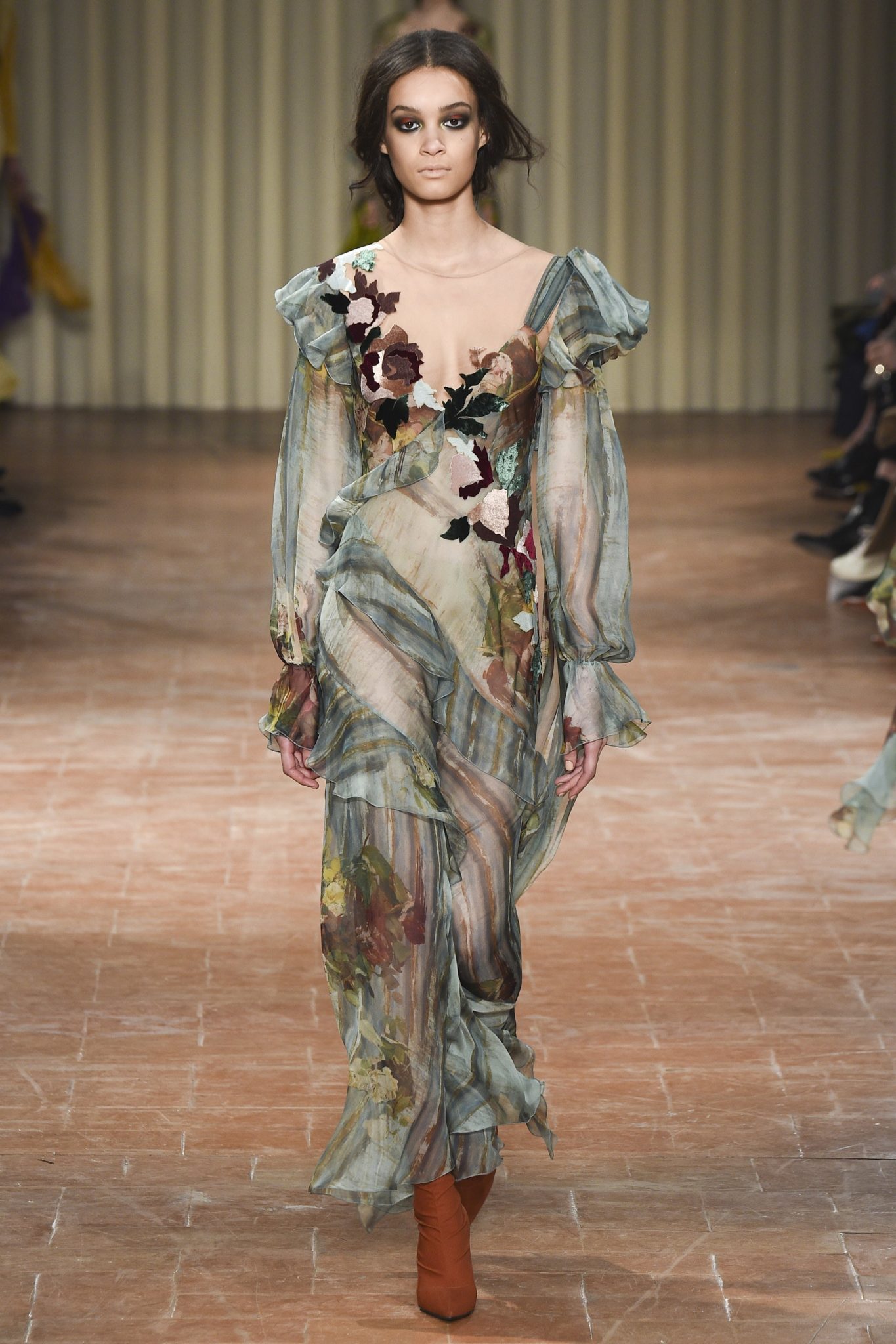 Alberta Ferretti took us on a fashionable trip to the beautiful streets and canals of Venice with scenic-printed maxi-dresses, two-piece ensembles, and streamline pencil skirts. Along with paying to tribute to her native country, Ferretti also adorned the runway with applique evening dresses – like a flowing ethereal floral number with billowing sleeves – and simplistic everyday combos – like a solid black maxi-dress topped with an oversized black-and-white knit sweater. Her line was for everyone for every occasion, and you can bet that these Italian trends will be following suit here in the Windy City.