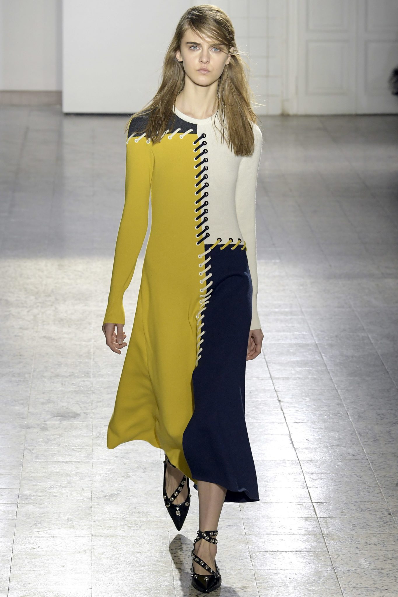 Cédric Charlier changed things up a bit this year. Not only did he move his Ready-to-Wear from Paris to Milan, but he also combined his men’s and woman’s collections. Known for his use of color blocking – flashback to the black and gold striped pants seen in his Spring 2015 Ready-to-Wear collection, and the cobalt and black shift dresses from his Resort 2013 line – Charlier followed (his own) suit with a long sleeved navy and yellow dress featuring shoe lace-inspired stitching for ladies, and sky blue and army green patchwork button-ups for men. With spring right around the corner, we can’t think of a better way to embrace a rainbow of colors than by adding geometric pops to everyday ensembles.