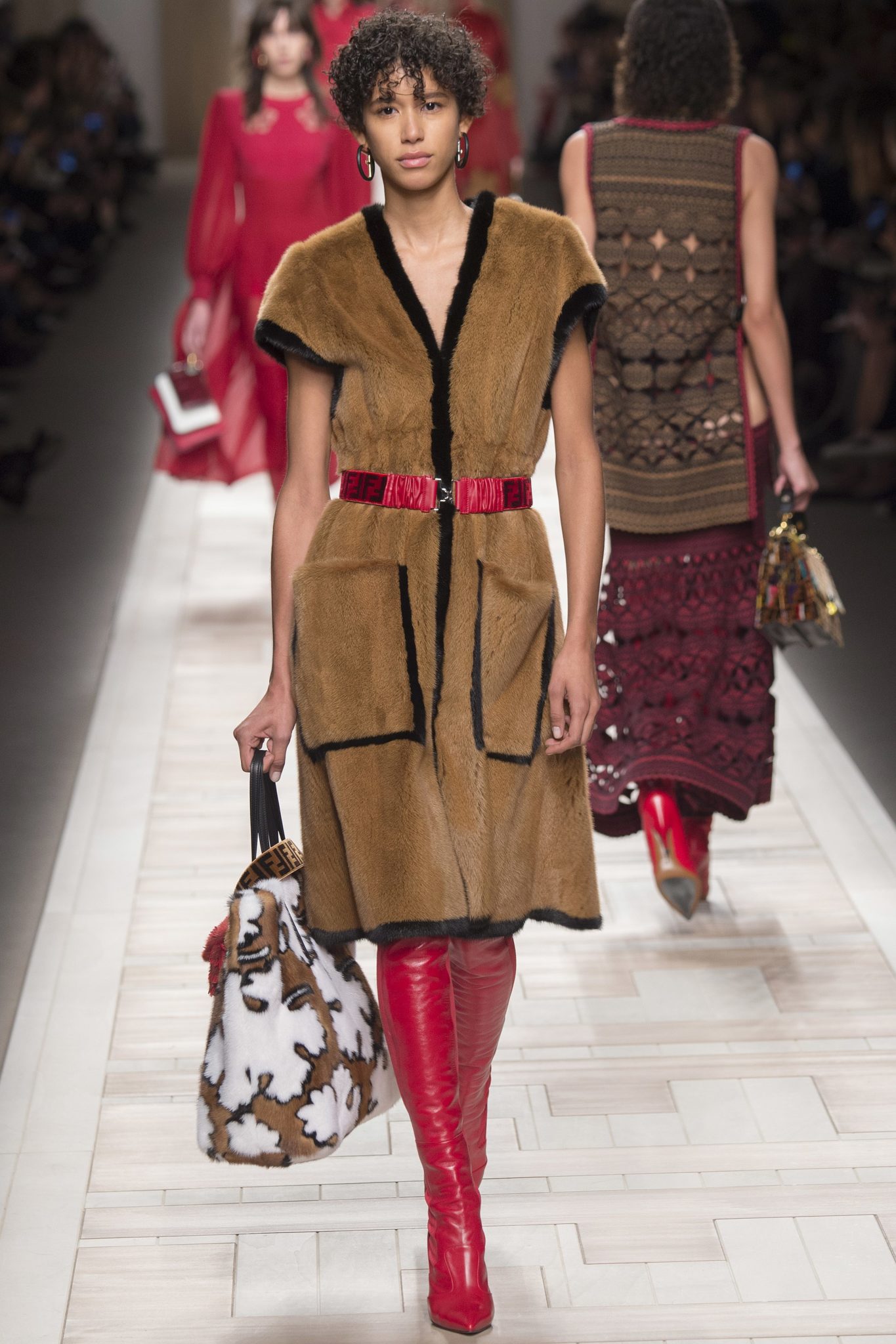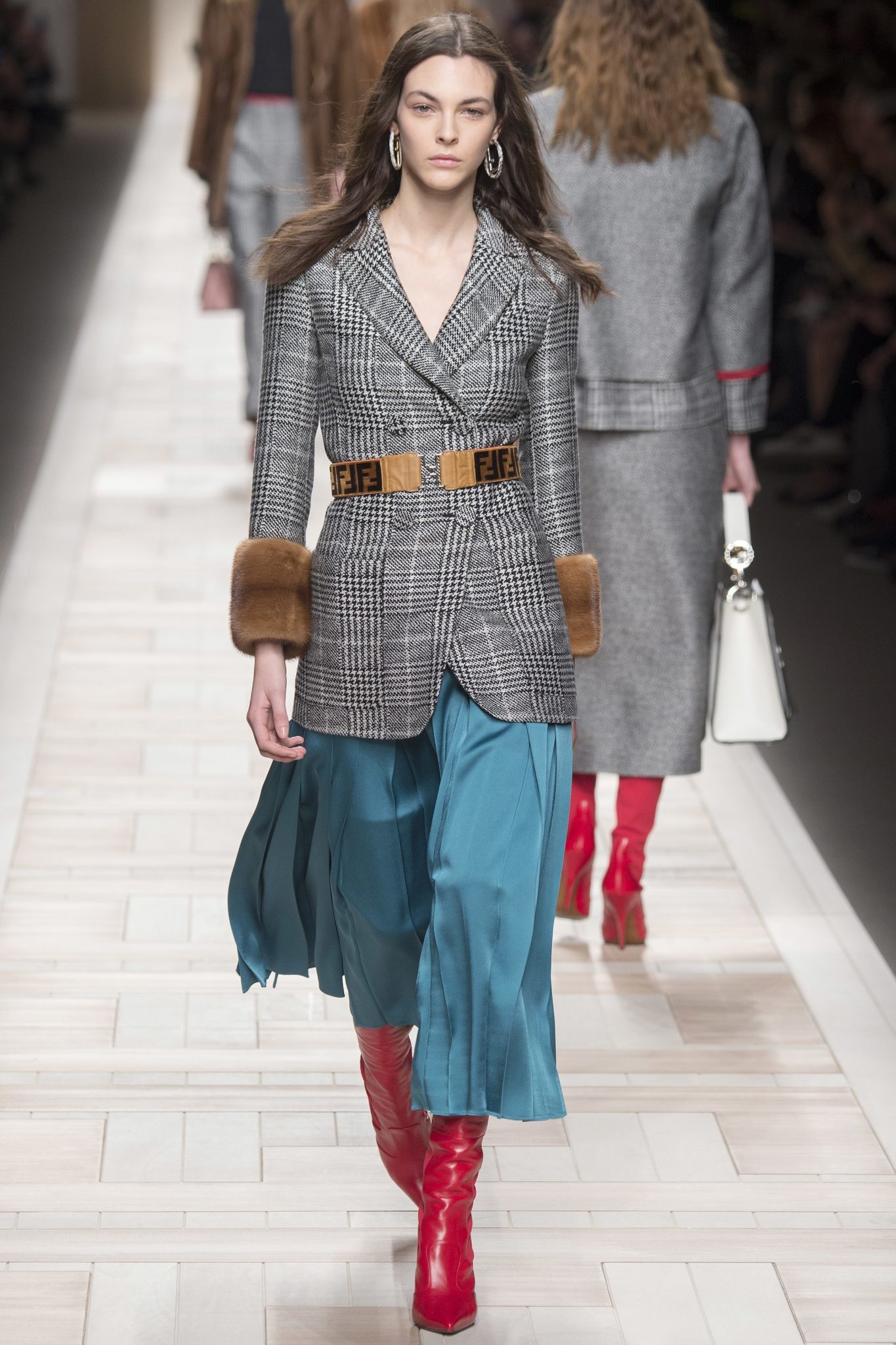 Something needs to be said about Fendi’s love for a tailored blazer and fur, and no we’re not complaining – we love it too. Karl Lagerfeld embraced both house favorites in a new way. Instead of incorporating fur as an oversized coat, cropped jacket, or a fluffy scarf – remember Fendi’s Pre-Fall 2015 collection? – fur accentuated tweed tailored blazers with fuzzy cuffs, covered a long duster vest, and adorned a slouchy tote bag.  Instead of wearing fur in a typical way, take note from Fendi and incorporate fuzziness into your clothing and accessories.