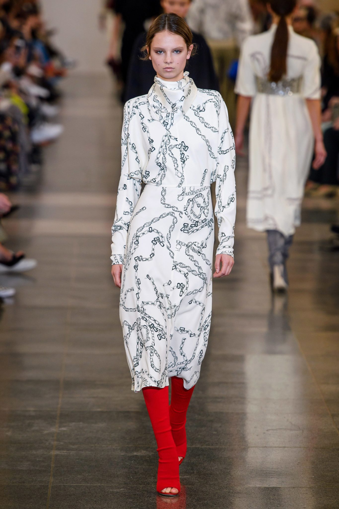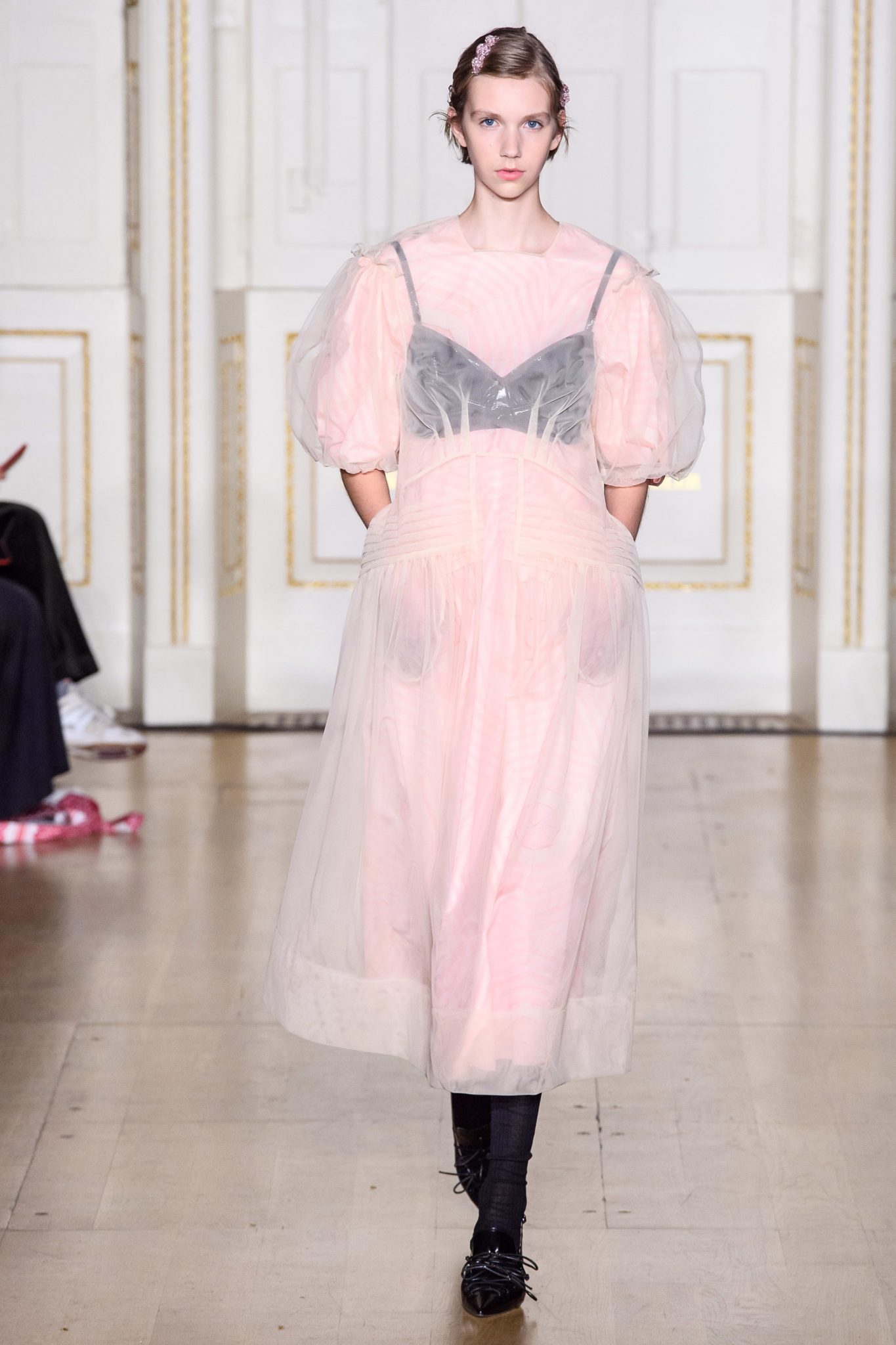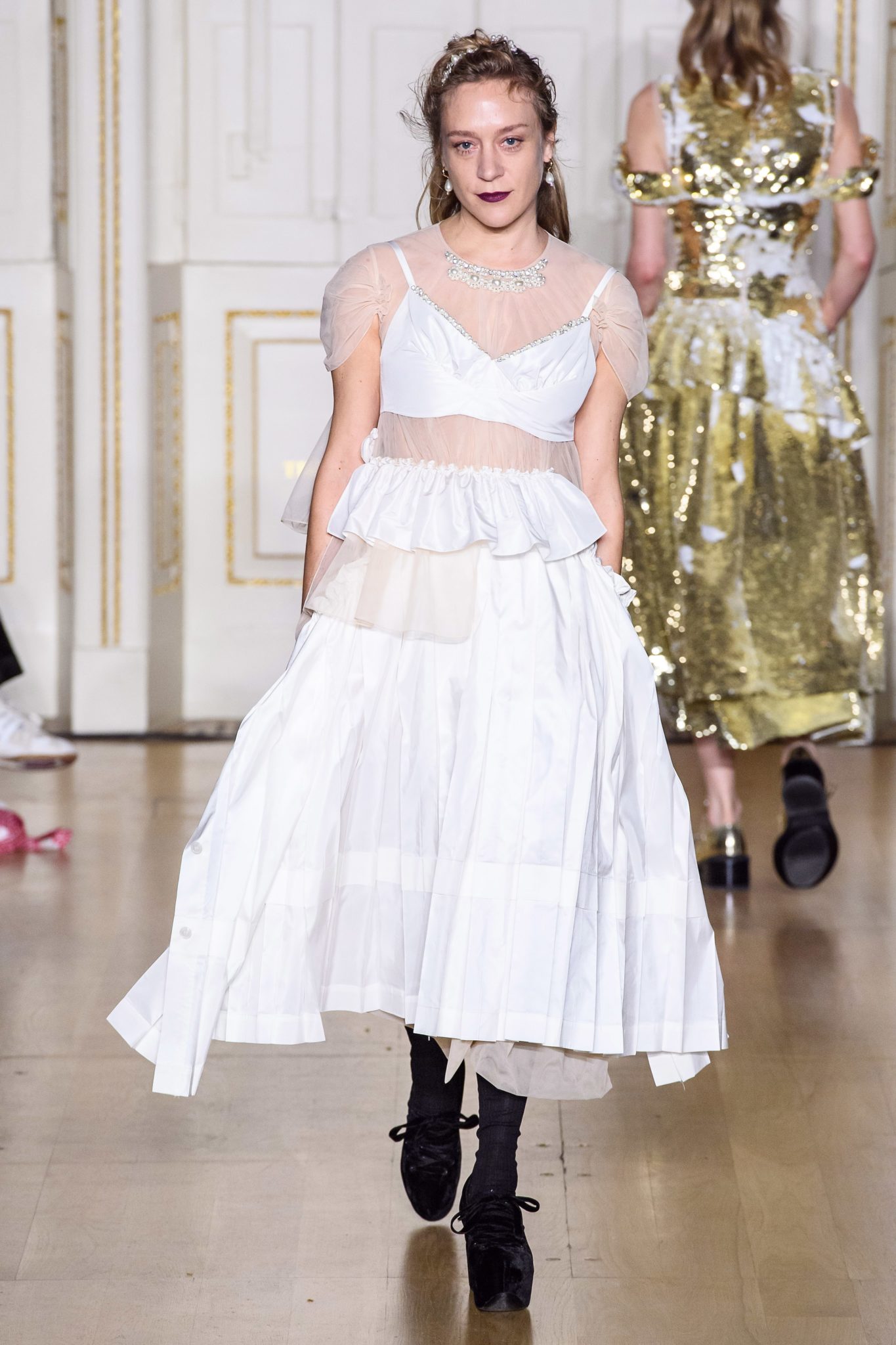 Simon Rocha presented a more youthful, toned down collection that is certain to be more commercial that previous seasons. The designer took a look at privacy, security, femininity and the female form, and showed looks draped in black see-through organza trench coats, ballerina pink dresses, an a perfect all-white skirt and top ensemble worn by Chloë Sevigny.