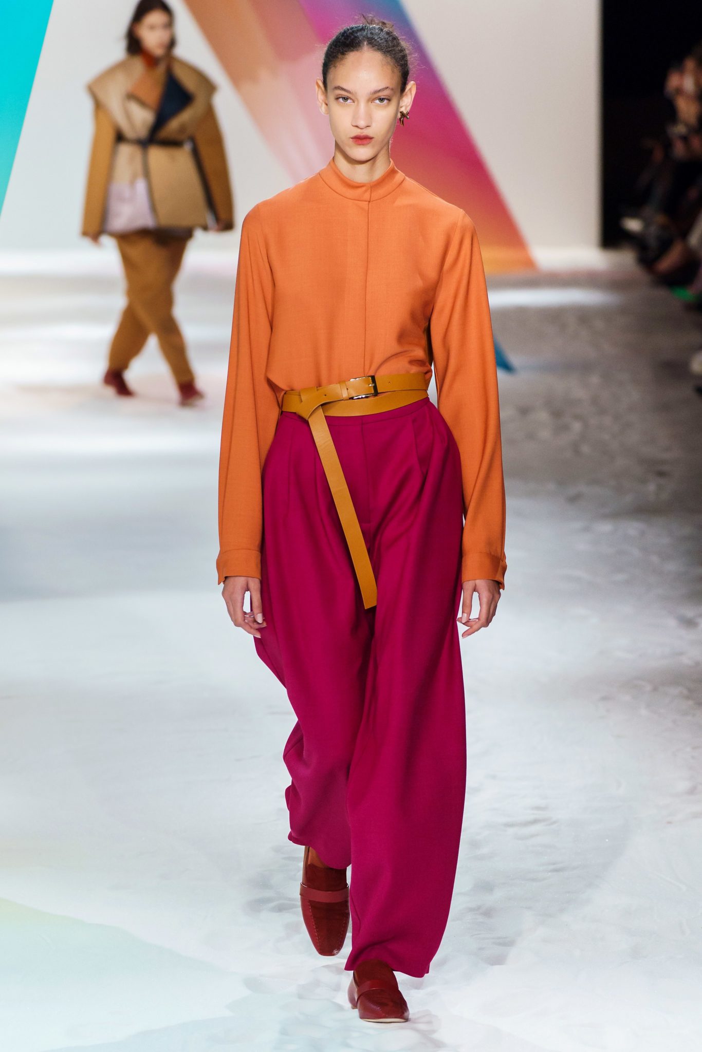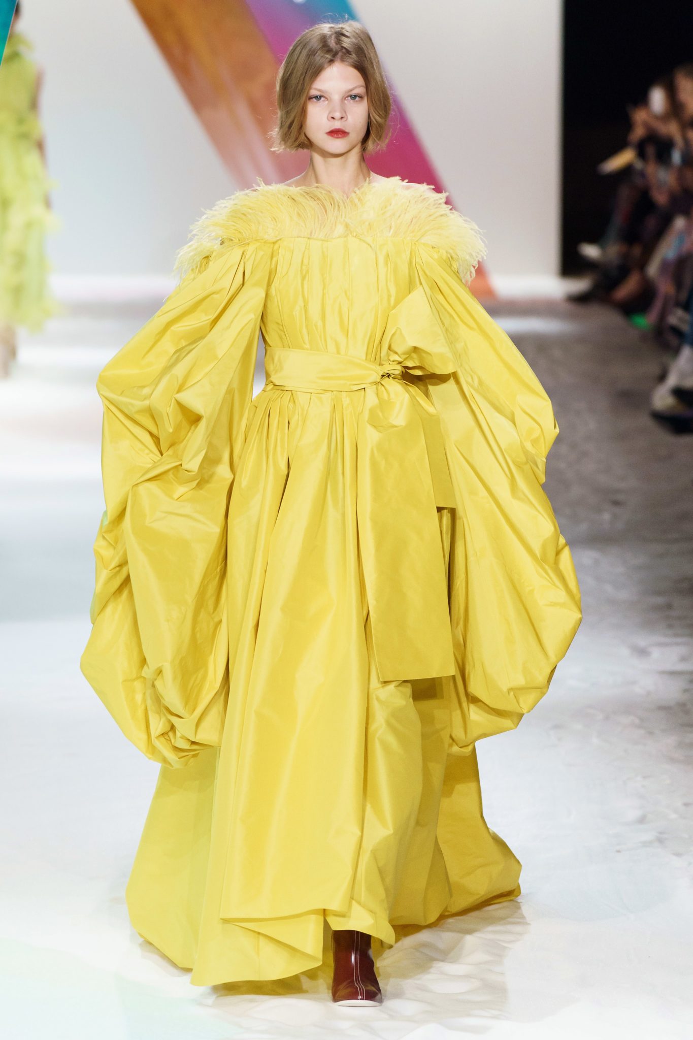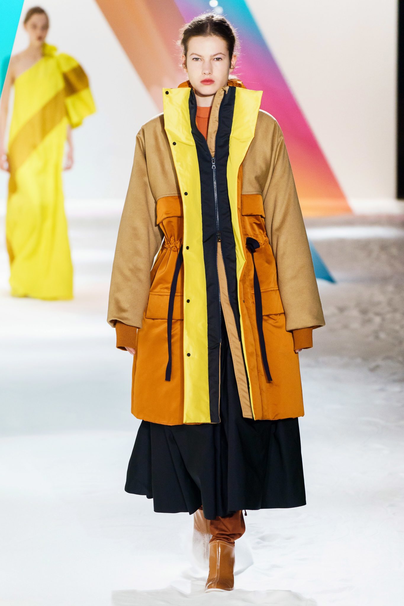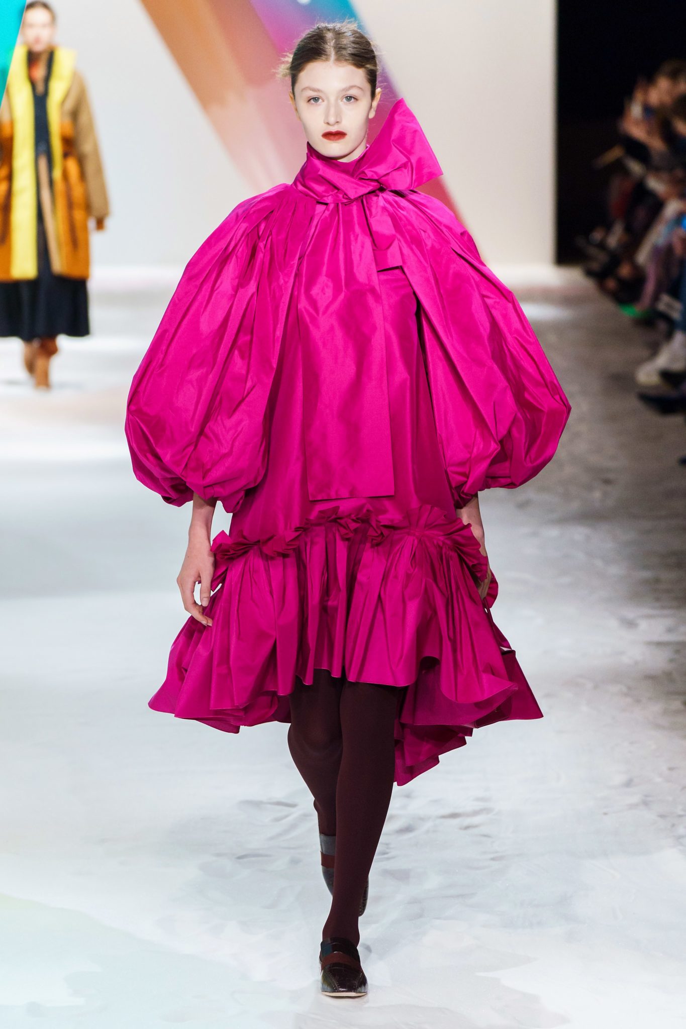 Volume and color was the name of the game at the Roksanda Fall 2019 show. Volume and color that is as wearable as it is fashion-forward. And that is exactly want the Roskanda customer wants and likes: Oversized tunic-shirts, color-blocked parkas, bright trousers and evening wear to die for (note a yellow taffeta strewn with feathers, magenta duchess banded with mustard stripes.) Superb.