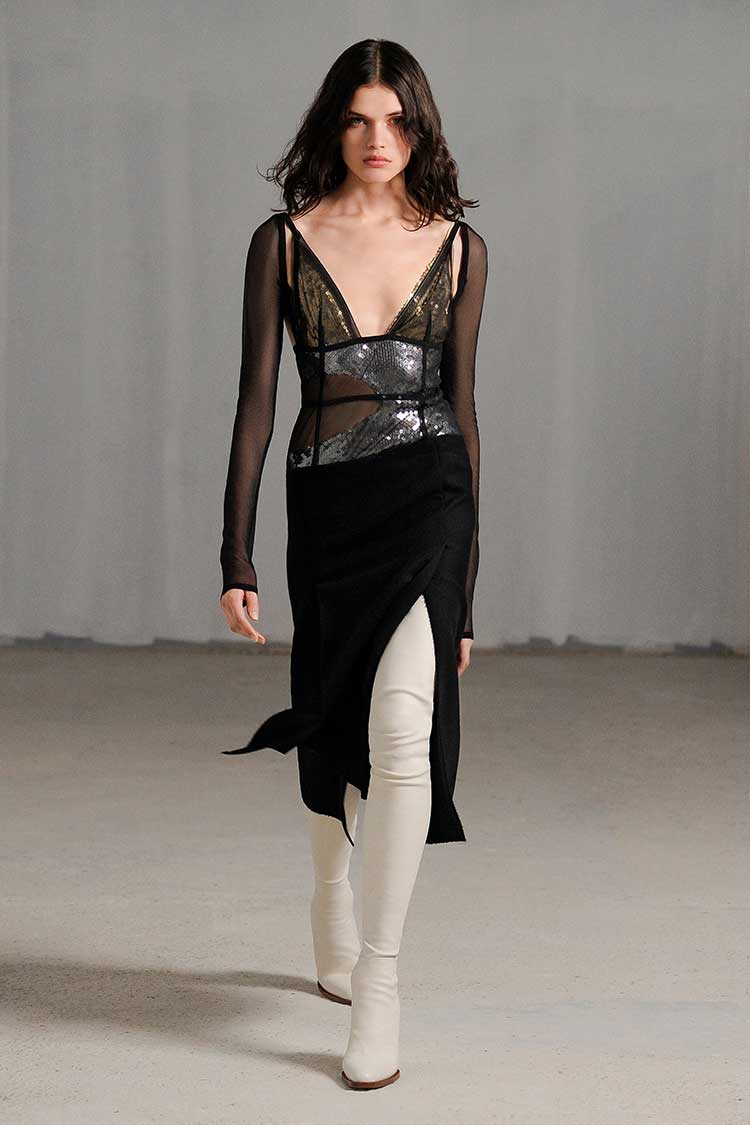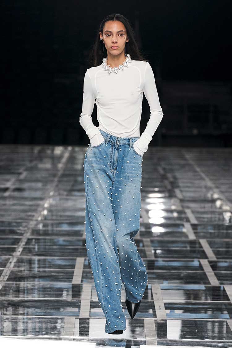 A white-shirt-and-jeans-combo is probably the most quintessential American uniform and many designers leaned into it. Some of the most noteworthy iterations came from Givenchy and their pearl-beaded jeans paired with a simple white shirt; Balmain’s slouchy jean-sculpural-white-shirt-mix, and Brandon Maxwell’s classic combination.