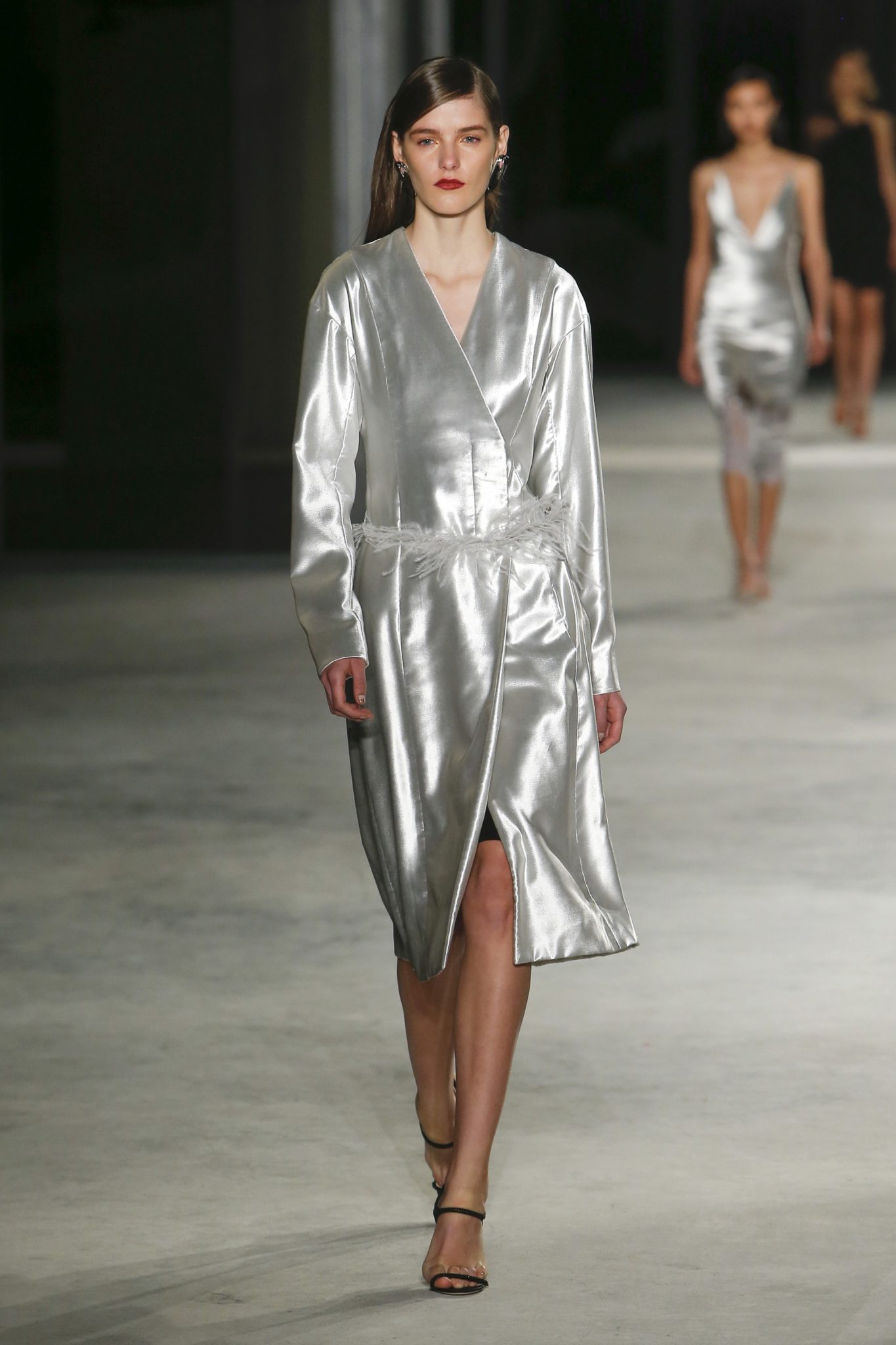 Next season’s silver takes an influence from foil really. It’s reflective and protective, and many designers interpreted it in their own way. Our favorite comes from Calvin Klein, where designer Raf Simons delivered his own clever spin on the look: an all reflective dress/gloves/boots combo we can;t get enough of.