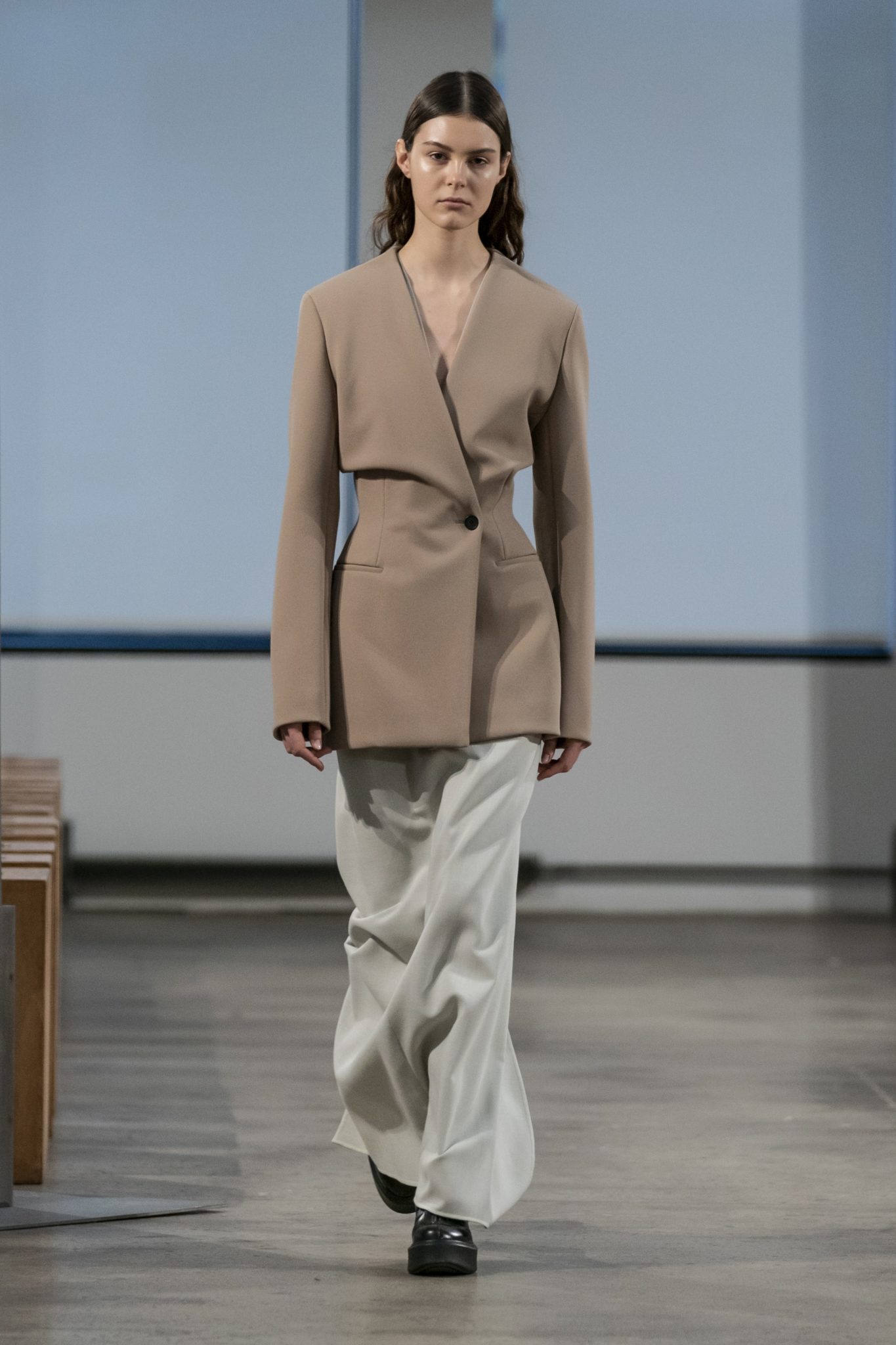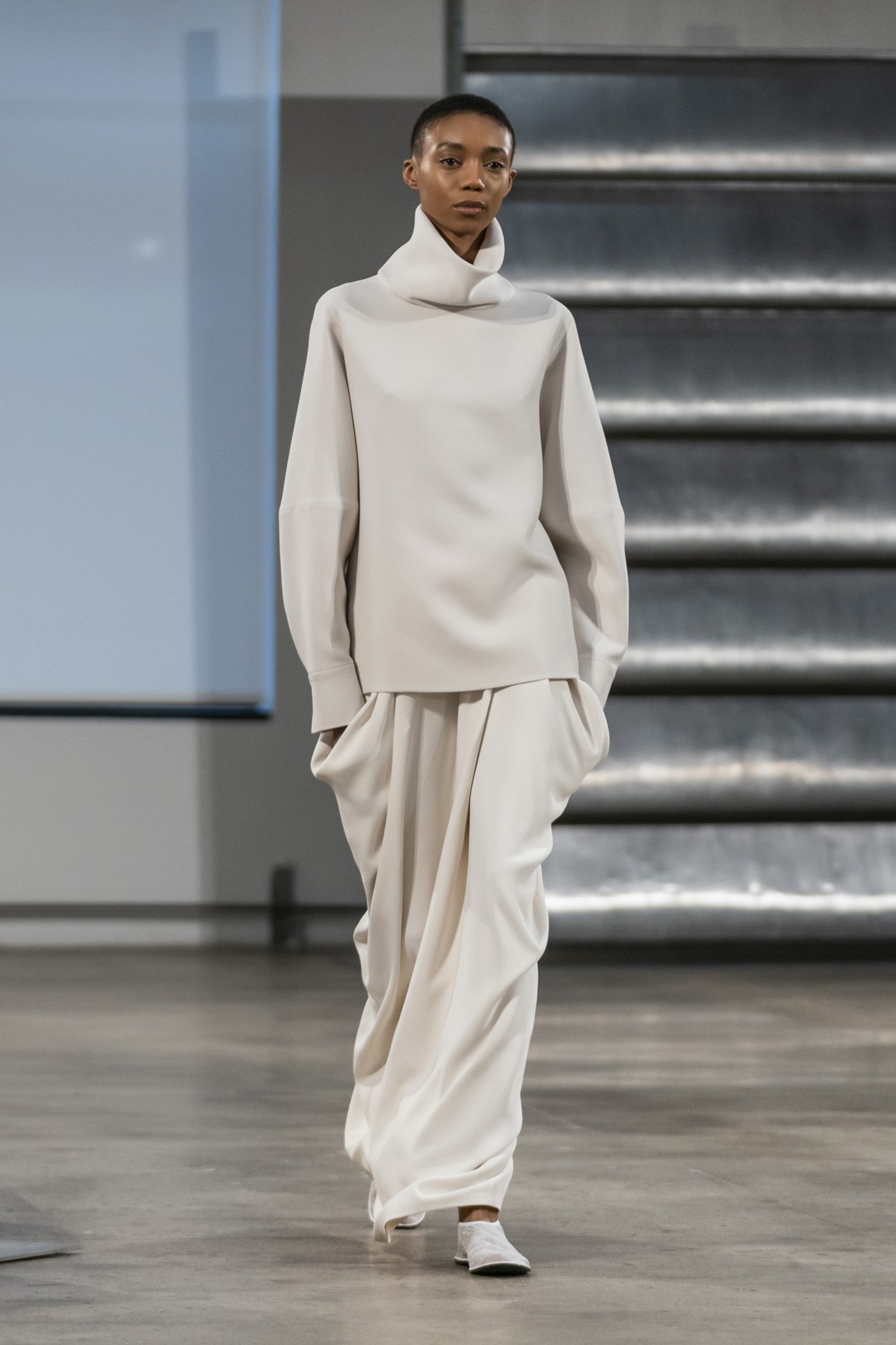 Soft colors, elongated silhouettes, and masterful layering is the essence of The Row Fall 2019. Mary-Kate and Ashley proved once again that they do, indeed, know fashion, how it works, how to stay true to the brand’s aesthetic yet push it forward. Everything about this collection is perfect — the series of coats and elongated jackets mostly stripped of any detail but gently nipped at the waist; the slightly volumenous dresses and shirt layered over and over to perfection. This collection was not full of noise, but rather impact.